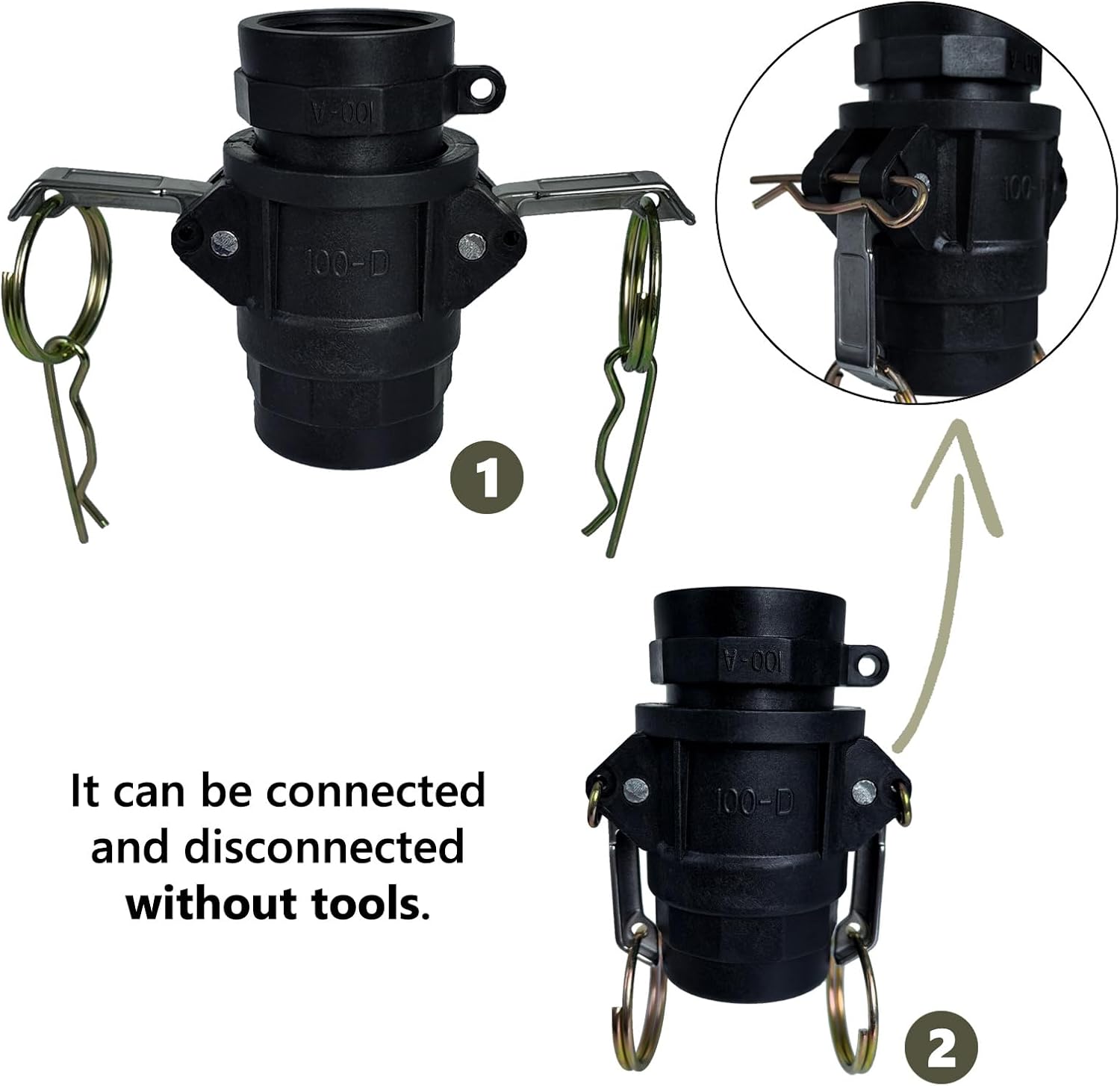 - EASY TO INSTALL: Quick hose camlock couplings can connect/disconnect hose to tanks, pumps or other equipment in a faster way. It can be connected and disconnected without tools. Simply slide the cam lock adapter into the camlock coupling with normal hand pressure, then press the cam levers down.The working pressure of 1” is up to 150 psi