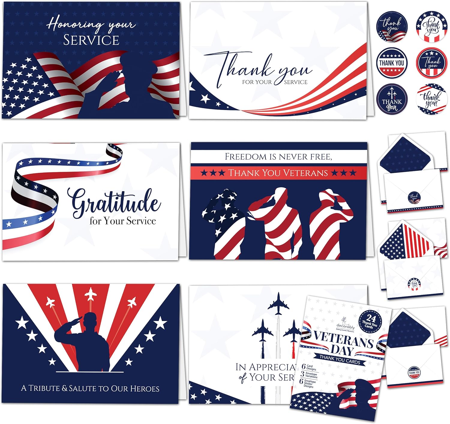24 Pack 6x4in Veteran Thank You Cards with Envelopes and Stickers 6 Patriotic Designs Thank You for Your Service Cards