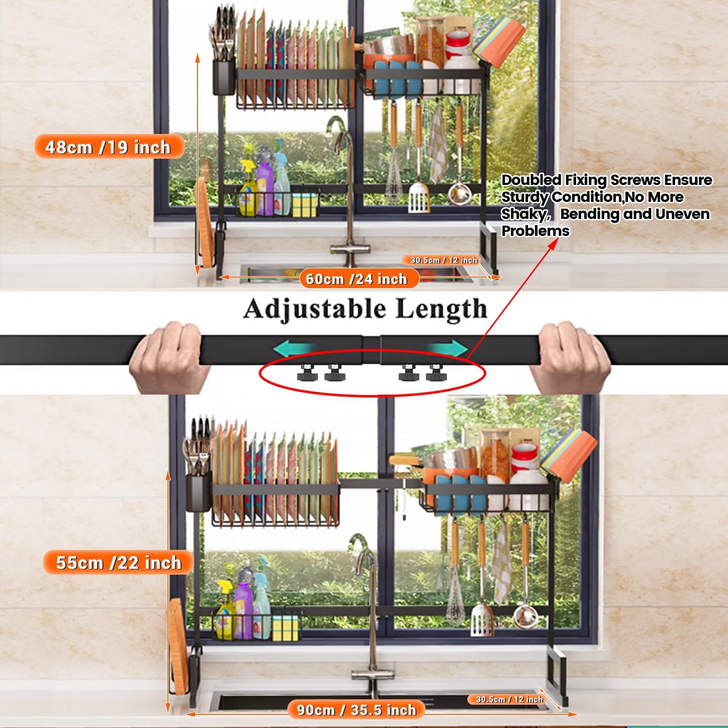 - 【Tips Before Purchase】Please carefully measure the length of your sink at first. Your Sink Length should be ≤35" and if it beyond 35", please choose our another larger over sink dish rack. Also mind the faucet (Height≤17") and the cabinet (another 15 or 20 inches away from the upper cabinet to place the plates), the height of this rack can be adjusted from 19" to 22", so please make sure you measure your faucet and cabinet so that the dish rack doesn’t touch them or get in the way.