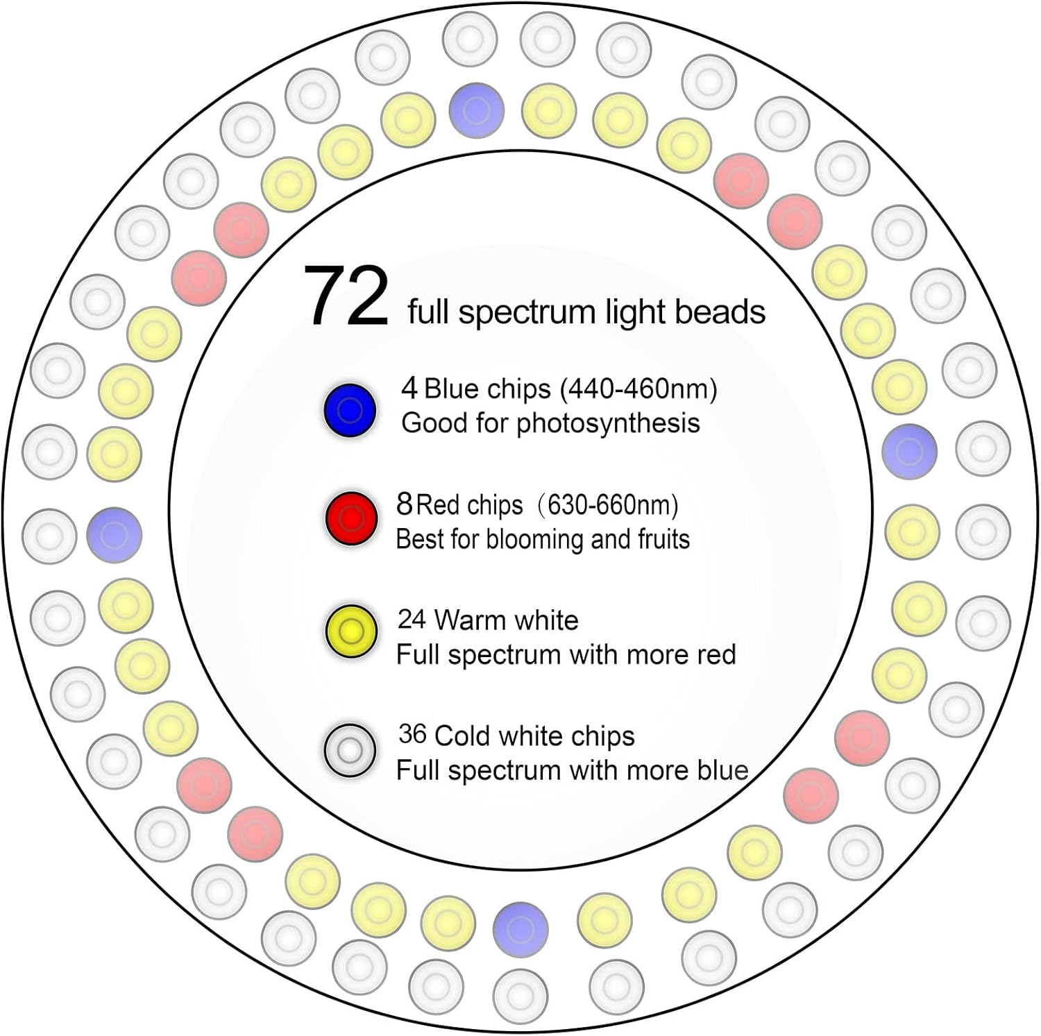- 72 LED Grow Light Full Spectrum - Compact grow light with high quality super bright LEDs, offer full spectrum 380nm-800nm, including white5000K/36 LEDS,warm white 3000K/28 LEDS,red/6 LEDS,blue2 LEDS to effectively promote indoor plant growth any time of year, beneficial to entire growth period.