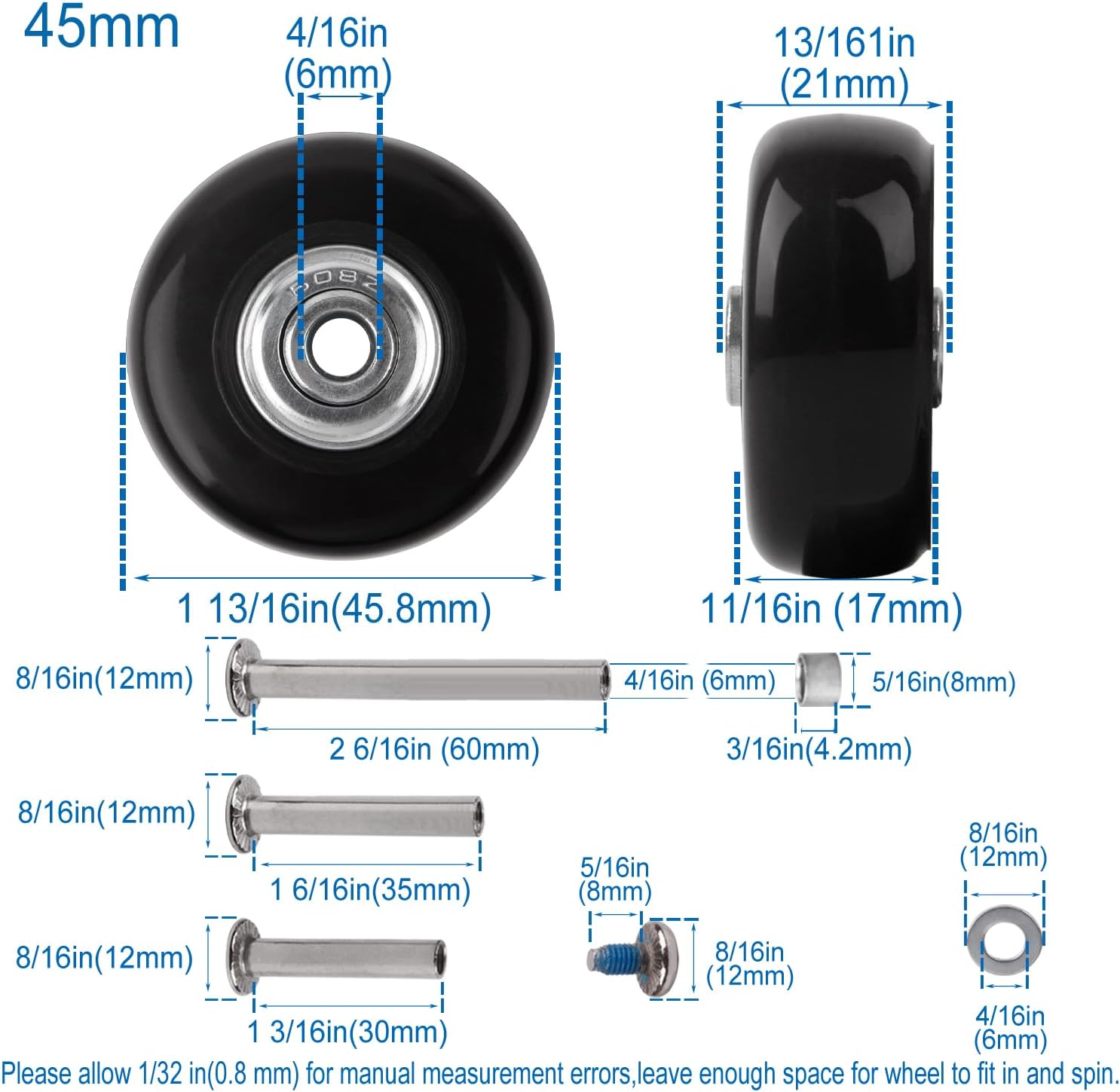 - UNIVERSAL FIT: This set of 4 replacement wheels features 3 different size axles to fit a variety of luggage and carts with outer diameters of 1.8inch/45mm, wheels house wider than 0.8inch/21mm.