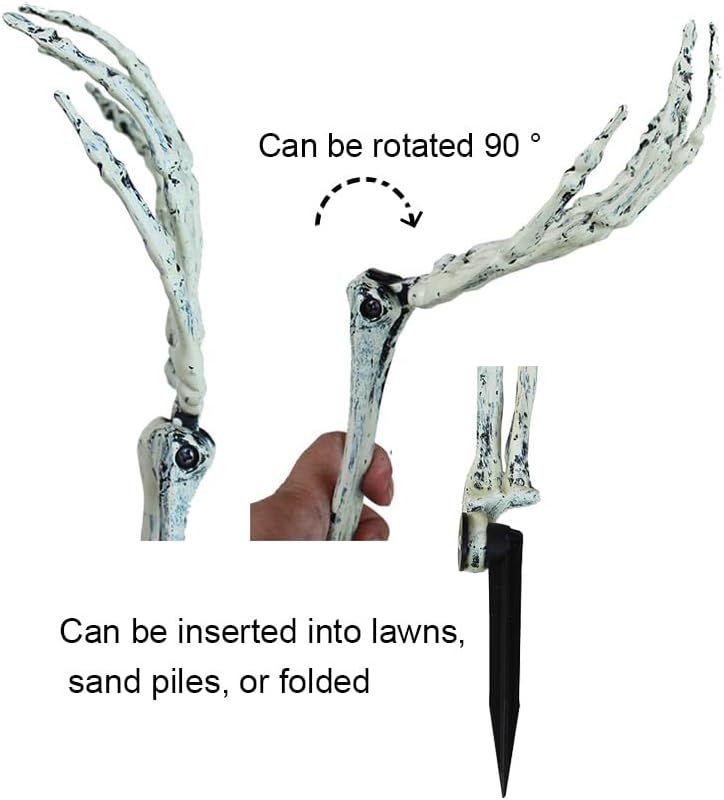 - Life size Skeleton Hands: 4 Pcs Skeleton Arms with Plastic Stakes ( Each Arm Measures 46 x 9 cm/ 18 x 3.5inch). The arm stakes work well at holding them in place against any wind.